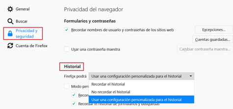 - Abre Firefox, ve a su menú de configuración que se encuentra en la esquina superior derecha y haz clic en Opciones > Privacidad y seguridad. En la sección Historial, abre el menú desplegable y selecciona Usar una configuración personalizada para el historial: