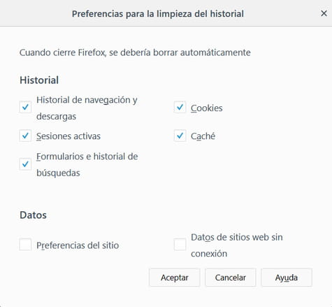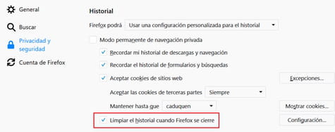 - Activa la casilla Limpiar el historial cuando Firefox se cierre: