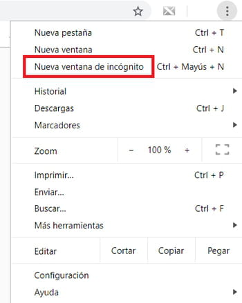 - La única manera de navegar en Internet sin que Google Chrome guarde el historial de navegación es navegando en modo de incógnito. Para activar este modo, ejecuta Google Chrome, abre el menú Controla y personaliza Google Chrome (botón con tres rayas horizontales) en la esquina superior derecha de la ventana y selecciona Nueva ventana de incógnito: