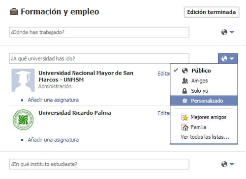 Perfil limitado: también puedes crear un perfil limitado para que ciertas personas vean solo ciertas informaciones. Por ejemplo, para que tus colegas de trabajo inscritos en Facebook vean solo la parte profesional de tu perfil. Para esto, ve a tu perfil, selecciona información y haz clic en