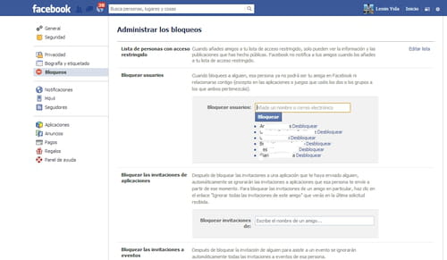 Bloqueos: puede impedir que una persona pueda buscarte, agregarte o ver tu perfil. Para esto, escribe su nombre o correo electrónico en el campo