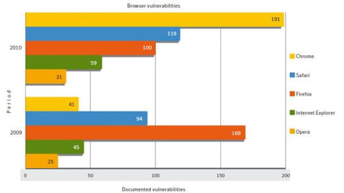 Este es el gráfico del informe anual de Internet Security Threat Report 16 de Symantec, muy ilustrativo sobre este punto, mostrando el número de fallas identificadas en cada navegador en 2010 y en 2009.