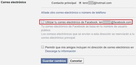 Facebook, se crea automáticamente una dirección de correo electrónico (nombre_de_usuario@facebook.com). Los mensajes que se envíen a esta dirección se reenviarán a tu cuenta principal, incluyendo