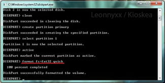 format fs=fat32 quick. Para las unidades de disco duro, escribe