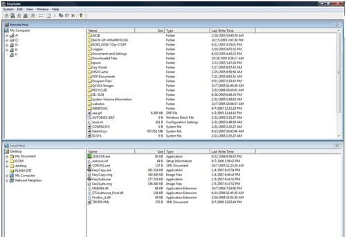 La interfaz de transferencia puede tener la apariencia del Explorador de Windows, con una ventana para el PC local y otra ventana para la otra PC conectada.