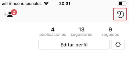 app de Instagram y pulsa el icono en forma de reloj que se encuentra en la esquina superior derecha de la pantalla: