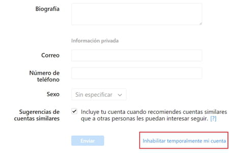 Inhabilitar temporalmente mi cuenta. Selecciona el motivo por el que deseas deshabilitarla, ingresa tu contraseña y haz clic en