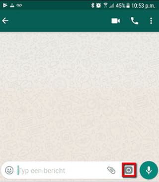 El proceso para enviar archivos de fotos y archivos de vídeo a través de WhatsApp es casi idéntico. Para tomar una foto, toca el icono de la cámara ubicado al lado del campo para escribir mensajes: