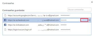 Contraseñas guardadas aparecerán todos los sitios en los que has iniciado sesión, así como el nombre de usuario y la contraseña (oculta detrás de puntos) que has utilizado. Para ver la contraseña, selecciona uno de los sitios y haz clic en
