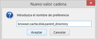 - A continuación, busca la entrada browser.cache.disk.parent_directory. Si no la encuentras, créala y nómbrala browser.cache.disk.parent_directory (eligiendo Cadena entre las tres opciones que aparecen):