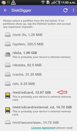 DiskDigger. Abre la aplicación y selecciona la partición donde se encontraban los archivos (fotos, vídeos, música, etc.) que deseas recuperar: