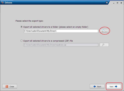 drivers en una carpeta, marca la primera opción, haz clic en la lupa y selecciona la carpeta donde serán guardados los