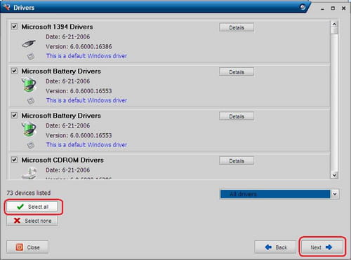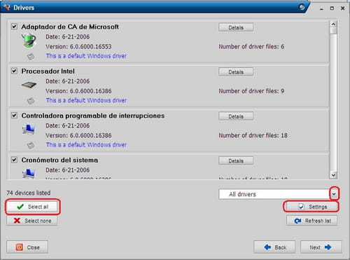 Una vez terminado el proceso anterior aparecerá una lista de todos los drivers instalados en el PC. Marca las casillas de los drivers de los que quieres que se haga una copia de respaldo o haz clic en el botón