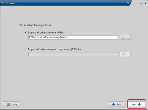 Ahora haz clic en la lupa para seleccionar la carpeta o archivo comprimido donde previamente has guardado la copia de respaldo de los drivers. Luego haz clic en
