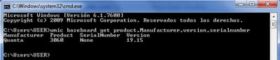 wmic baseboard get product,Manufacturer,version,serialnumber y presiona