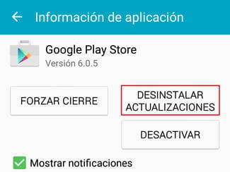 Desinstalar actualizaciones para regresar a la versión previa de Google Play Store. Se abrirá una ventana con el mensaje