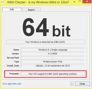 Puede hacerse a través de Windows, pero también con un pequeño programa que nos permite tener toda esta información de un vistazo. Solo descarga 64bit Checker y ejecútalo (no requiere ninguna instalación y funciona con todas las versiones de Windows, incluso Windows 2000 y Windows XP). En la sección Processor (Procesador) te aparecerá si tu procesador soporta sistemas operativos de 64 bits.