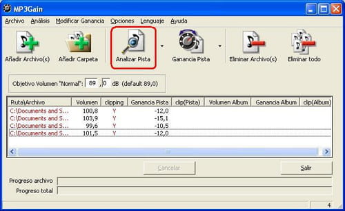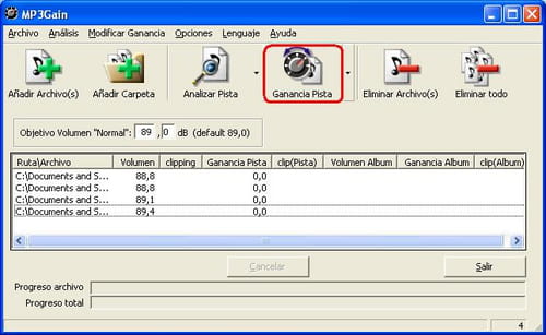 - Finalmente, para normalizar los archivos hacemos clic en el botón "Ganancia pista"