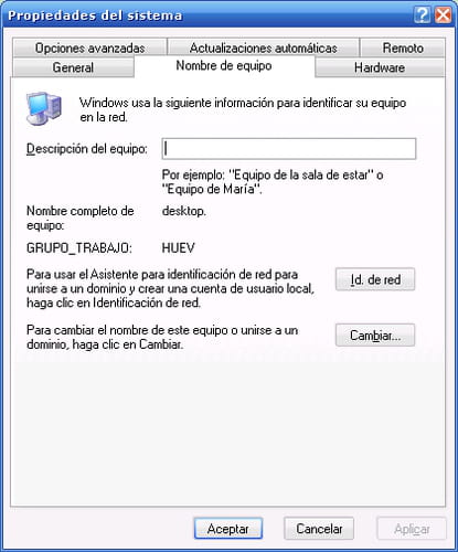 En la pestaña “Identificación” de la ventana “Red”, podrás ver el nombre del PC así como el grupo de trabajo en el que se encuentra, es preferible que los 2 PCs estén en el mismo grupo de trabajo (por ejemplo: WORKGROUP)