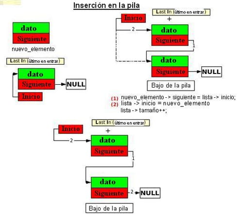 siguiente de cada elemento, la pila es recorrida del primero hacia el ultimo elemento.