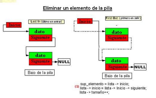 Para eliminar un elemento de la pila, simplemente hay que eliminar el elemento hacia el cual apunta el puntero