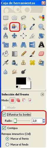 Abre Gimp y en la caja de herramientas, haz clic sobre la herramienta de selección de primer plano. Te recomiendo marcar la casilla "Difuminar los bordes" y poner el "Radio" en 2,0.