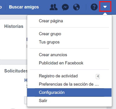 Facebook e inicia sesión. Enseguida, haz clic en el botón en forma de triángulo que se encuentra en la esquina superior derecha y selecciona