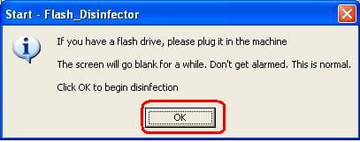 - Cuando aparezca el mensaje: If you have a flash drive, please plug it in the machine conecta la memoria USB o dispositivos USB externos que puedan estar infectados. Luego haz clic en OK
