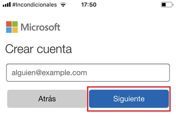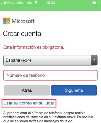 Te aparecerá la ventana de Microsoft desde la cual podrás crear una cuenta usando tu número de teléfono. Selecciona tu país, ingresa tu número telefónico y toca
