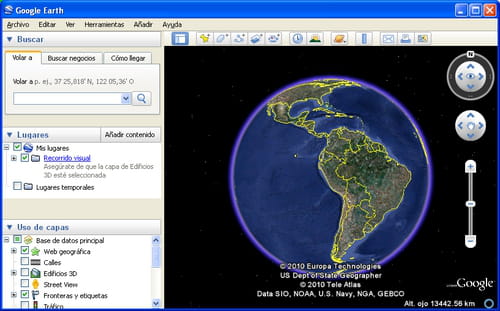 - La ventana principal de Google Earth te muestra el globo terráqueo con los continentes. Puedes arrastrar con el puntero para ubicarte y hacer doble clic para acercarte o, si no, escribir en el buscador la calle o el lugar de tu interés.
