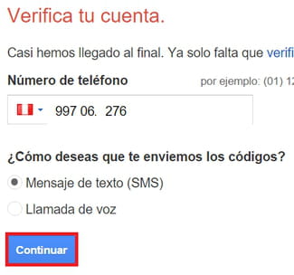 Ahora, solo falta la etapa de verificación de cuenta. Ingresa tu teléfono móvil, elige una de las opciones (mensaje de texto o llamada de voz) y haz clic en