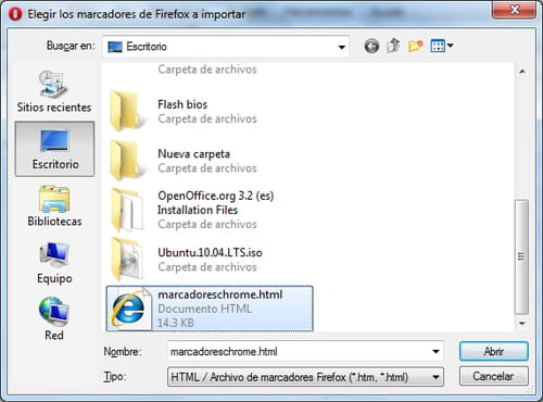 - Selecciona el archivo de marcadores que creaste previamente con Chrome y haz clic en Abrir.