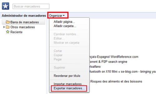 - Haz clic en Organizar y selecciona Exportar marcadores a un archivo HTML: