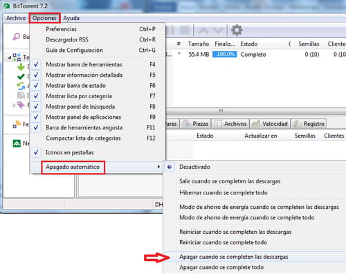 - Haz clic en el menú "Opciones > Apagado automático > Apagar cuando se completen las descargas" y listo!