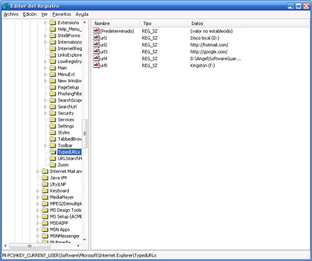 HKEY_CURRENT_USER\Software\Microsoft\Internet Explorer\TypedURLs. Allí podrás eliminar todos los valores que crees conveniente, salvo el predeterminado: