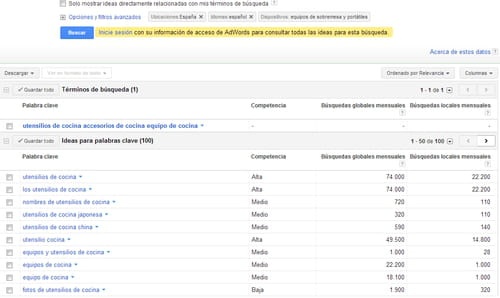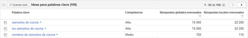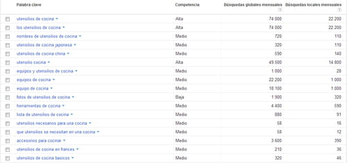 Para el ejemplo, escojamos un sitio web especializado en la venta de artículos de cocina, que hace un inventario de palabras clave.